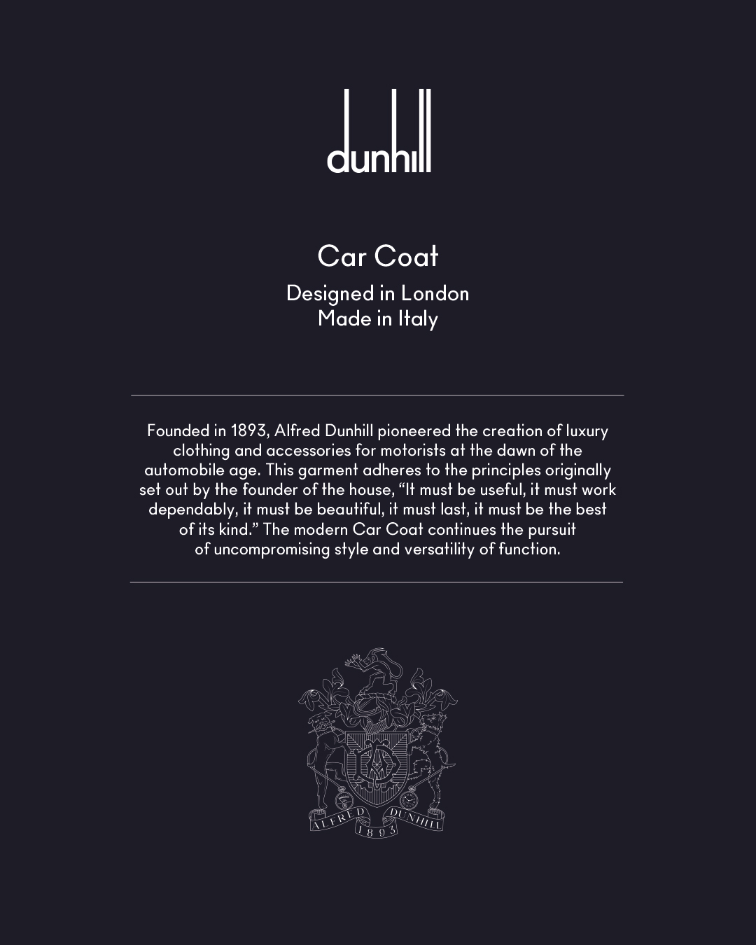 Inspired by the archetype of early British driving coats, the glen check car coat embodies a tradition of purposeful design and minimalist luxury. The cotton-silk blend, created by an Italian mill with a legacy in the development of high-performance fabrics, lends fluidity and movement to the piece. Rendered in British khaki and reflecting dunhill’s long-standing pursuit of refined masculinity, it transforms function into an enduring expression of modern British sophistication.